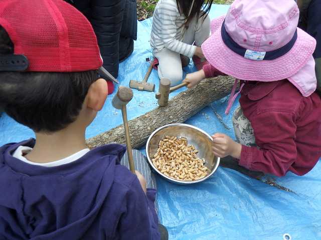 毎月第2土曜に開催している森づくり体験。今月はドングリランドの木を使ったシイタケの植菌にチャレンジします。