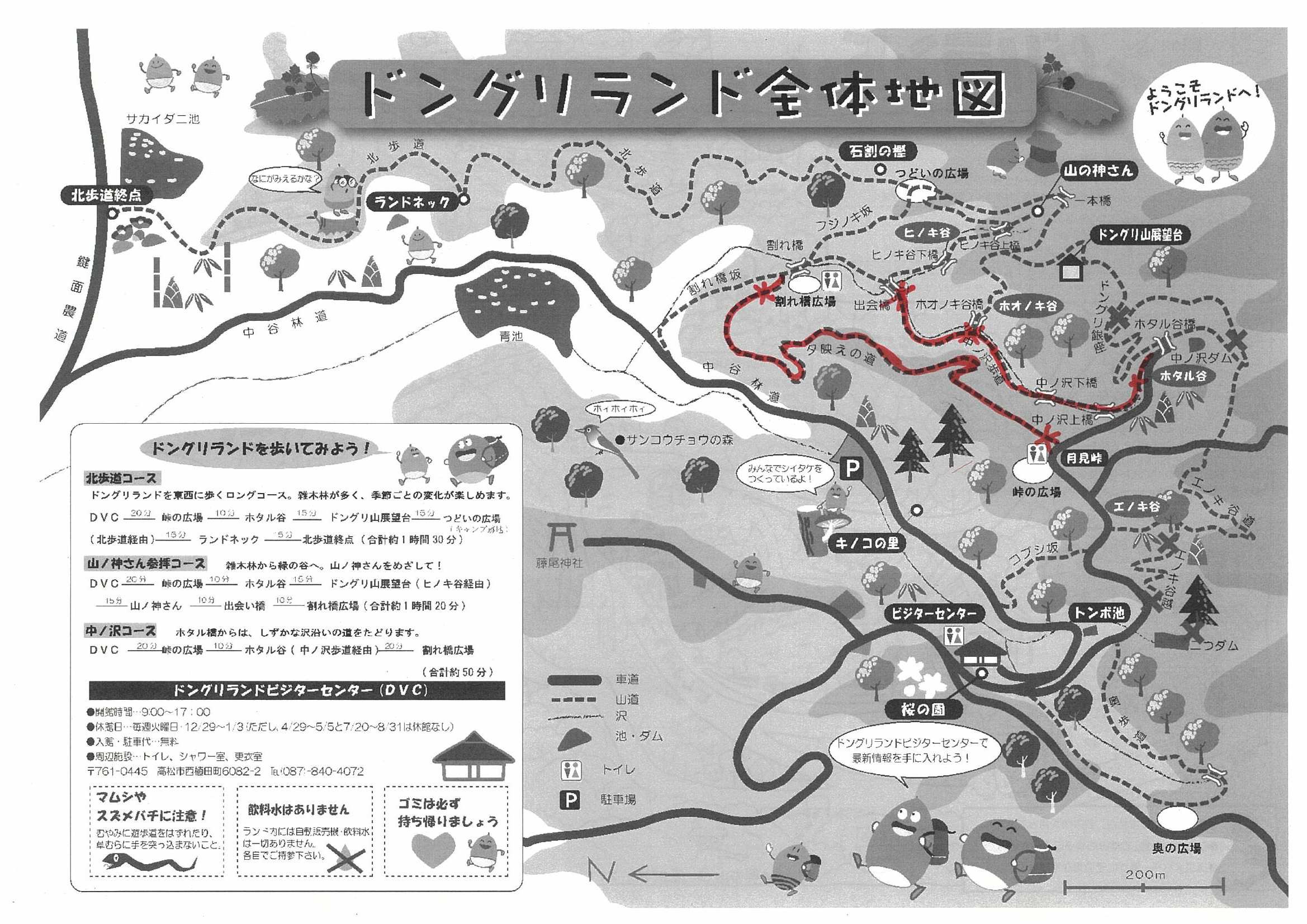ナラ枯れ伐採に伴い、夕映えの道と中ノ沢歩道(ホタル谷~ホオノキ谷橋)を通行止めといたします。通行止め区間は、以下の地図の赤色部分です。