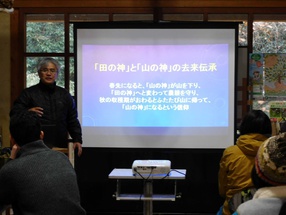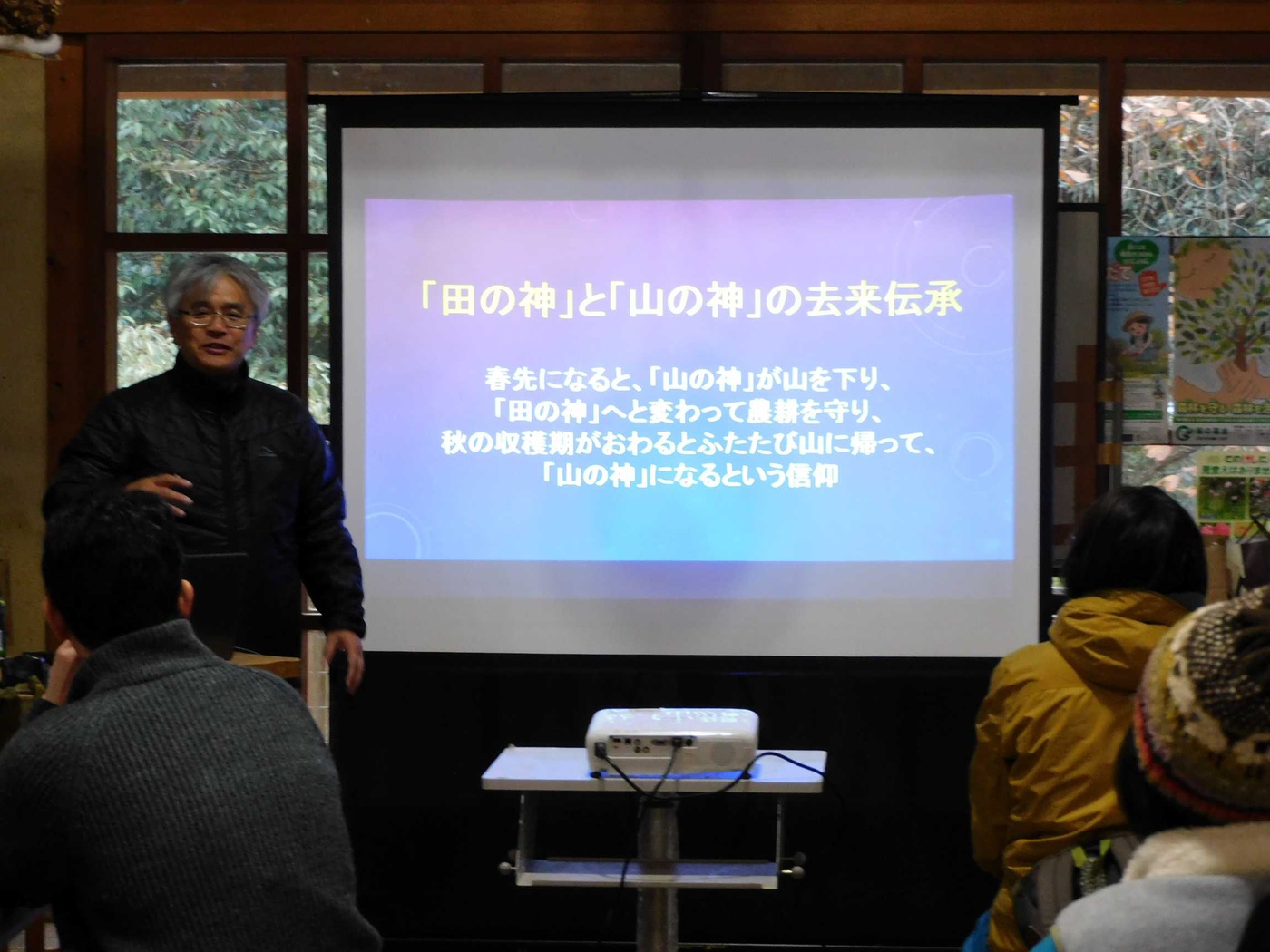今回は特別に、五色台にある瀬戸内海歴史民俗資料館の田井静明先生をお招きして、香川県の山の神様と里山の歴史、そして里山の暮らしについてお話しいただきました。山の神様には女性の神様が多い事、山の神と豊作をお祈りする田の神様との関係、また山の神様のお祭りでは魚のオコゼをお供えすることなど、今まで知らなかった興味深いお話に、参加者のみなさんからおもわず驚きの声があがっていました。