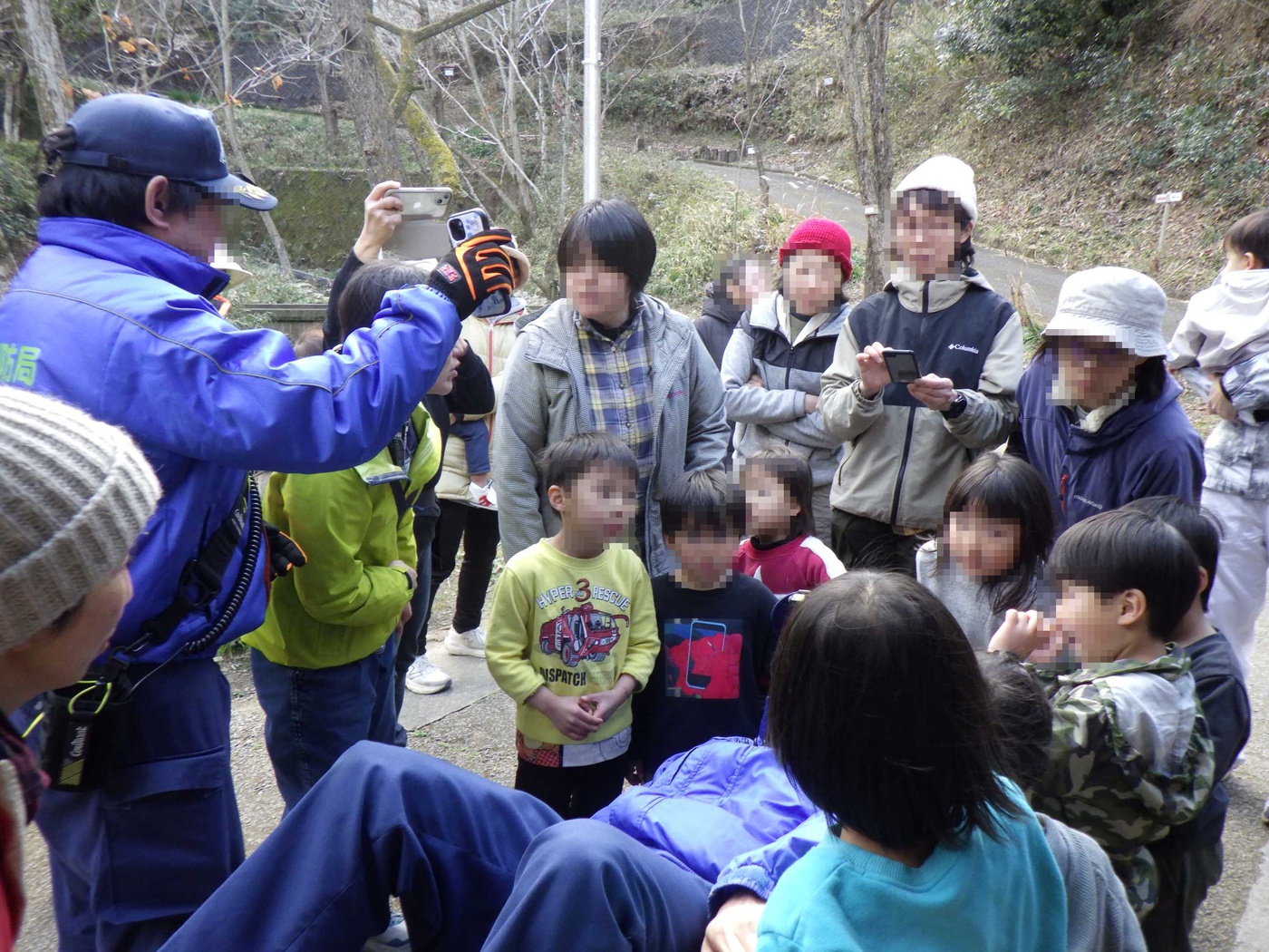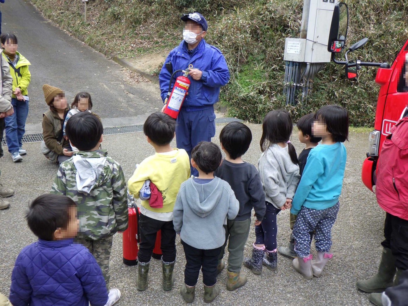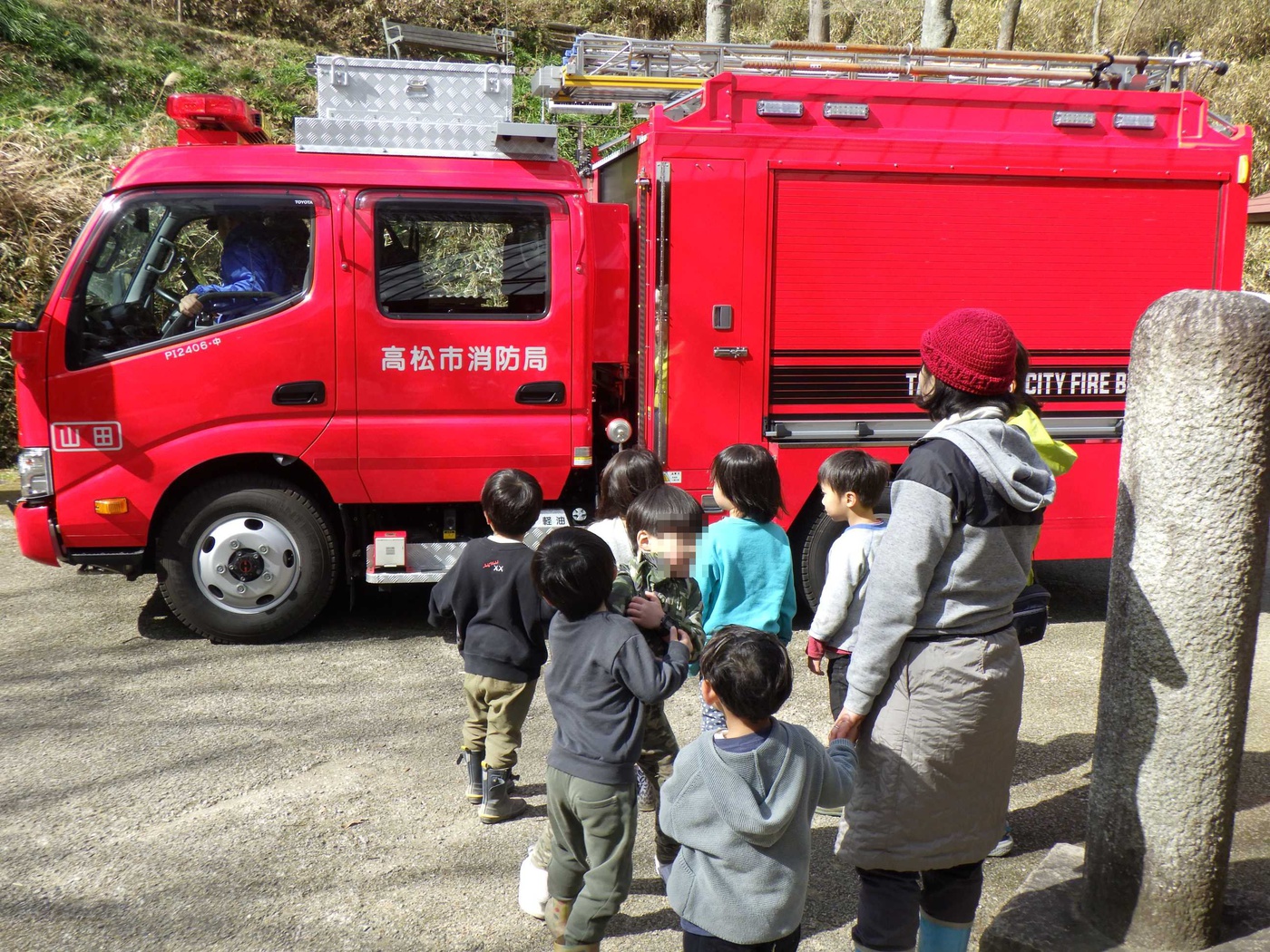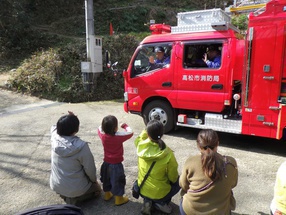 お山歩隊のみなさんの前に、赤い大きな自動車がやってきました。高松市消防局の消防車です。今日はドングリランドの消防訓練の日。冬に入ってから空気の乾燥した日が続き、ドングリランドでもおくどさんで火を使うことが多いため、火の取扱いには毎日神経を使っています。