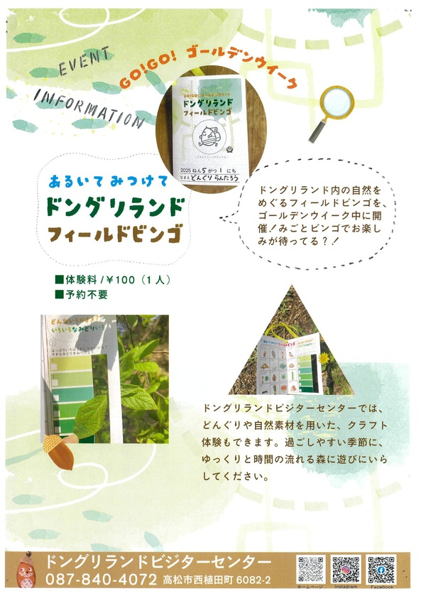 お問い合わせ、お申し込みはドングリランドビジターセンター (電話087-840-4072)、もしくはこちらからお願いします。