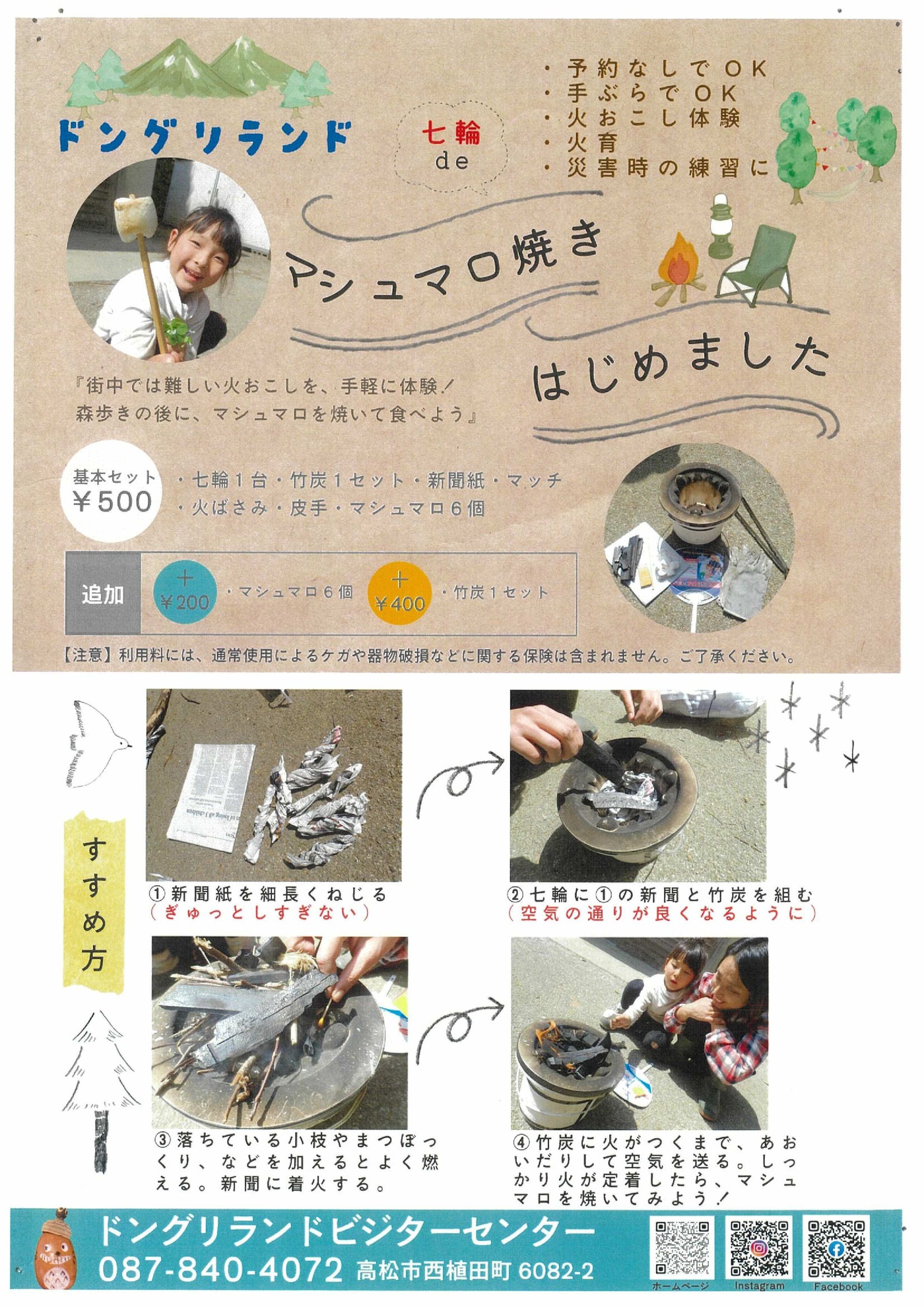 ドングリランドでは、ゴールデンウィークに昨年ご好評をいただいた「マシュマロ焼き」「フィールドビンゴ」を開催します!どちらも予約なしでご参加できます!